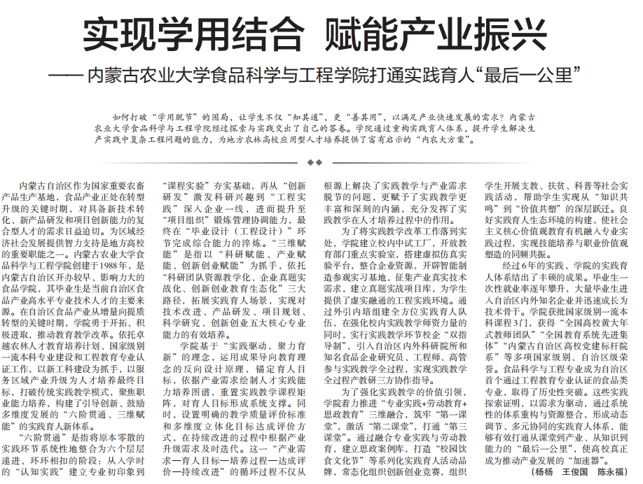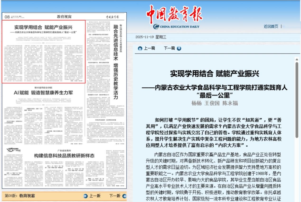 【编者按】《中国教育报》2025年11月19日第8版以《实现学用结合 赋能产业振兴-内蒙古农业大学食品科学与工程学院打通实践育人“最后一公里”》为题,专题报道了我校食品科学与工程学院在实践育人体系重构、产教融合协同育人中的创新实践与显著成效。文章系统总结了学院立足自治区食品产业转型需求,以“六阶贯通、三维赋能”为核心路径,打造全链条实践平台,整合科研、产业、双创资源,全面打通从课堂到产业的“最后一公里”。学院通过建设校内中试工厂、虚拟仿真实验平台、企业真题项目库,实施校企双导师制,将思政教育、劳动教育与专业实践深度融合,培养出一批批“知其道、善其用”的高素质应用型人才,为自治区乃至全国食品产业高质量发展提供了强有力的人才与科技支撑,树立了地方农林高校实践育人的“内农大样板”。