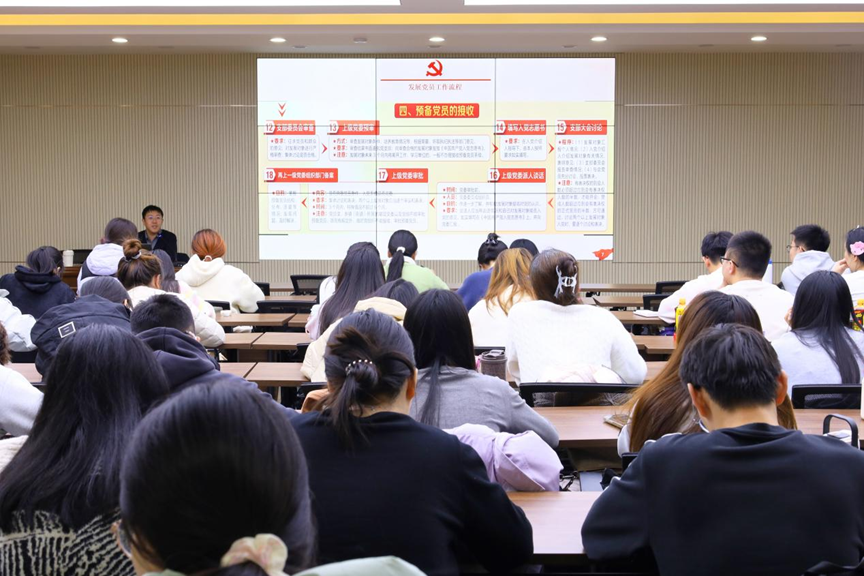 会议伊始,李子冲以“发展对象应知应会,入党手续和组织生活”为主题,从“严格履行发展党员手续”“行使践行党员权利义务”“落实党的组织生活制度”“争做合格党员”四方面阐述了入党流程的基本要求与组织生活的重要性。同时,他强调大家要深刻认识入党程序的严肃性,自觉用党员标准规范言行,在学习和工作中主动接受组织考验并把思想上入党作为终身课题。最后,李子冲希望同学们端正入党动机,加强理论学习,积极参与组织生活,在实践锻炼中不断提升党性修养,以实际行动争取早日加入党组织。