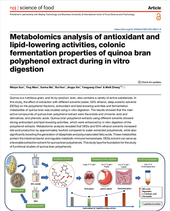 近日,食品科学与工程学院张美莉教授课题组在Nature旗下NPJ系列子刊《npj Science of Food》(中科院一区Top)发表题为“Metabolomics analysis of antioxidant and lipid-lowering activities,colonic fermentation properties of quinoa bran polyphenol extract during in vitro digestion(揭示藜麦麸皮多酚消化发酵特性,抗氧化降脂机制获代谢组学解析)”的研究成果,2022级博士研究生孙敏君为论文第一作者,张美莉教授为通讯作者。该项研究工作得到了国家重点研发计划(2023YFD1600704)的资助。