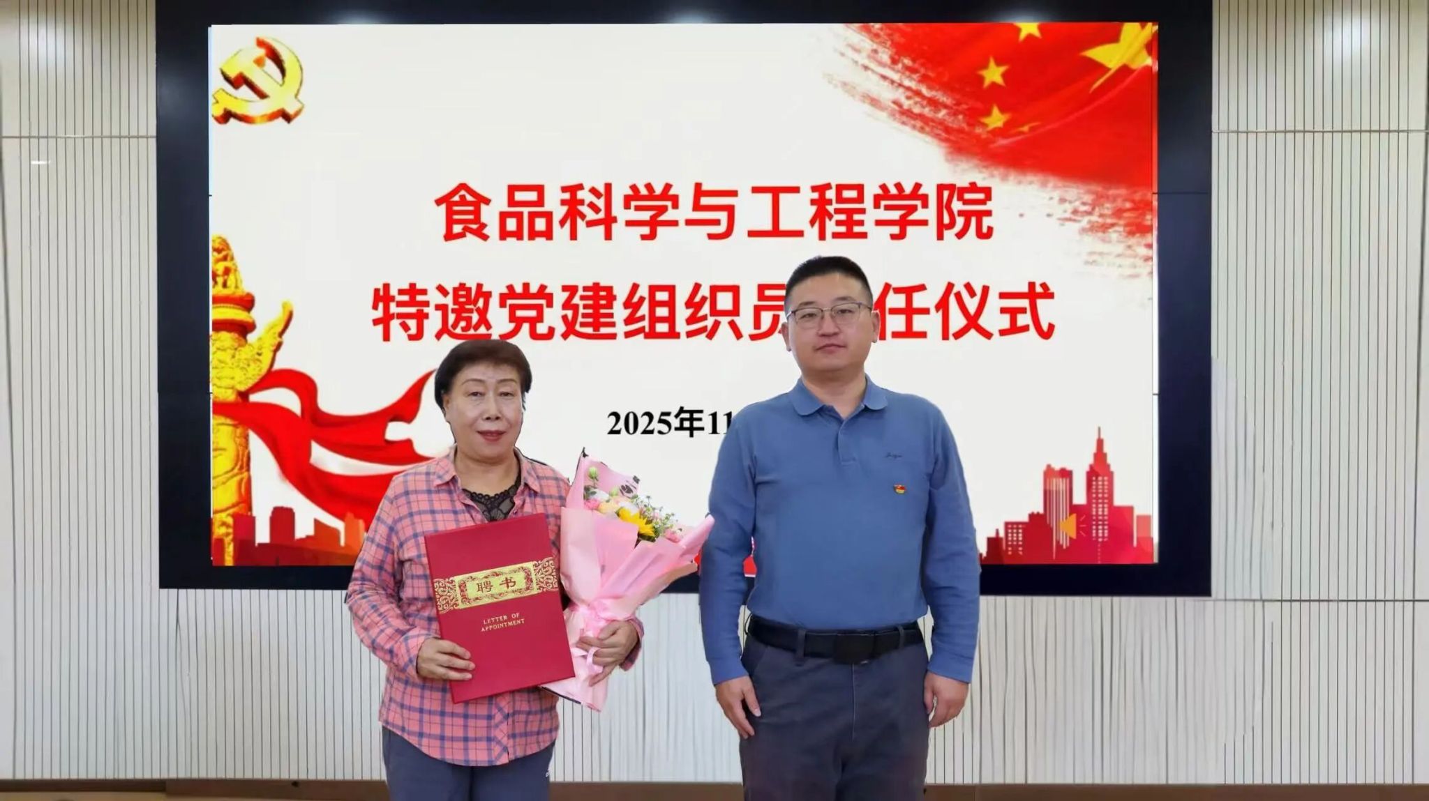 在食品科学与工程学院特邀党建组织员聘任仪式中,葛飞为乌兰老师颁发学院特邀党建组织员聘书并送上鲜花。