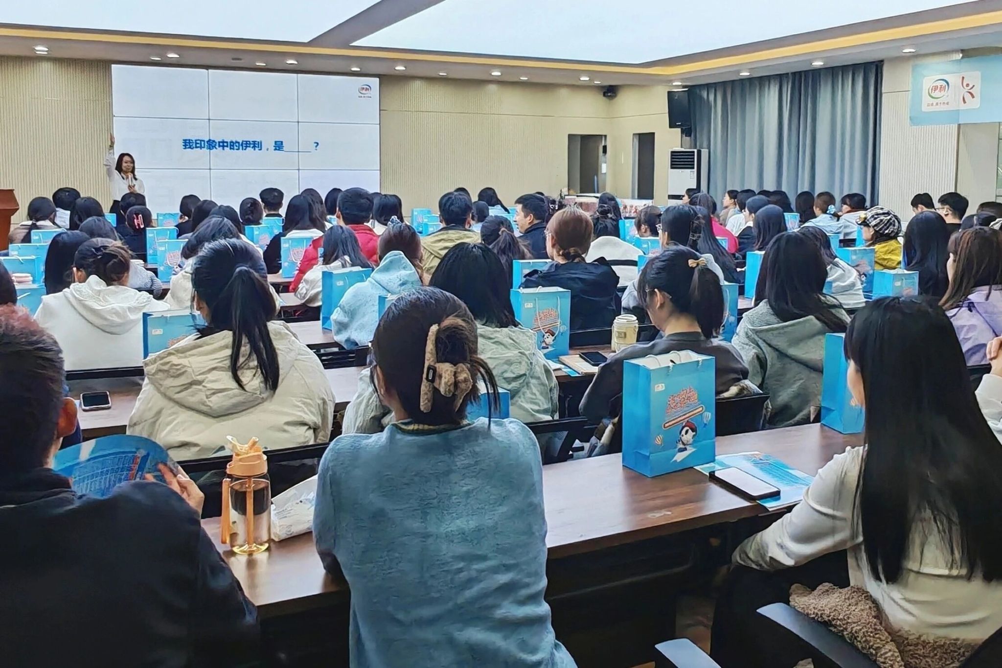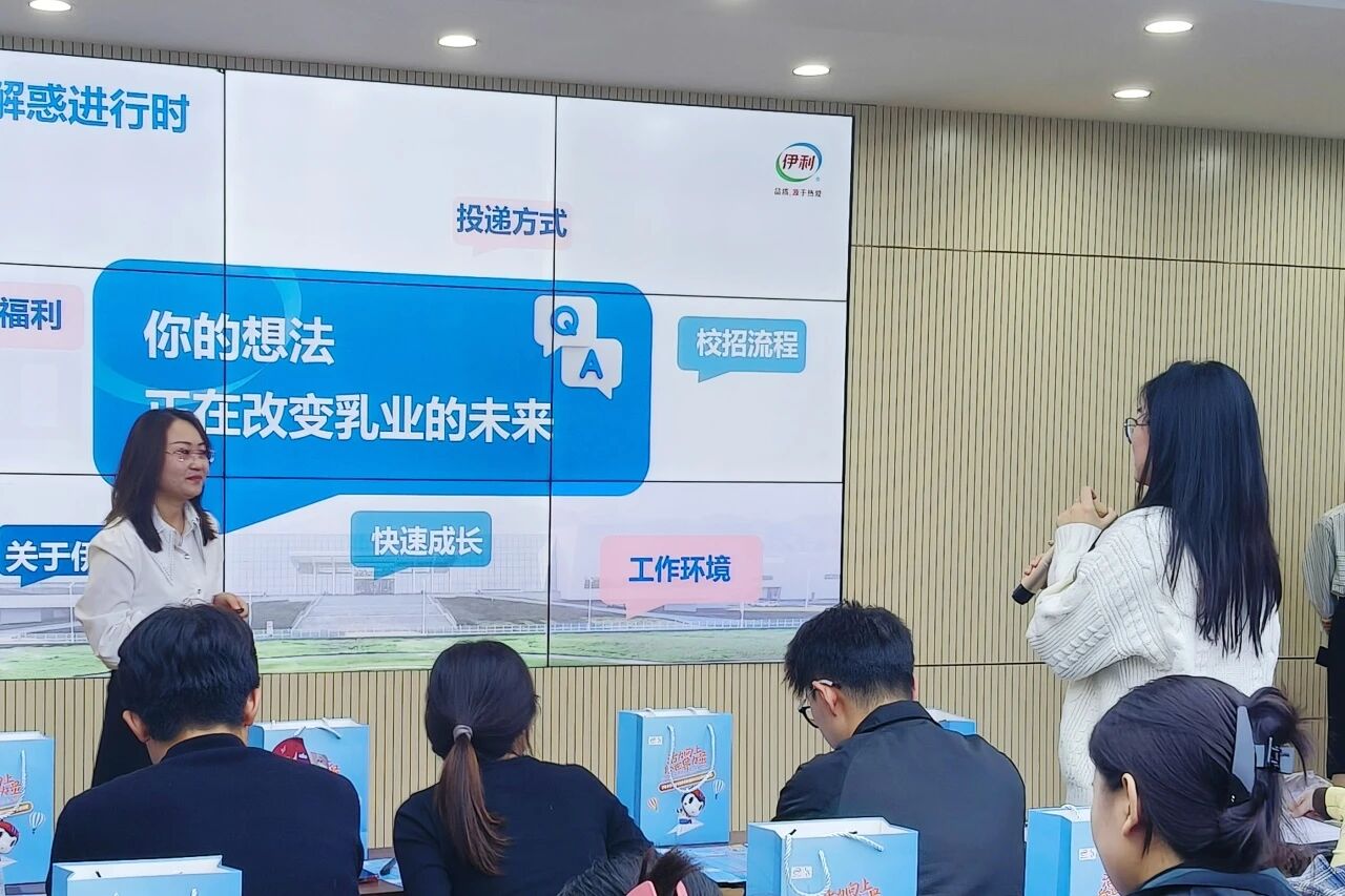 宣讲会最后设置了答疑环节,白海霞就同学们关心的投递方式、校招流程及后续工作安排等问题进行了解答,并通过提问互动赠送礼品,鼓励学生积极参与,进一步加深对伊利品牌与企业文化的了解。