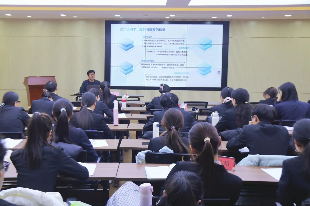 内蒙古农业大学学生工作部(学生工作处)副部长斯日古冷为学员作“学生干部在正心明道中修炼自我”主题讲座,围绕学生干部身份意义、误区与建议、案例分析三方面展开。他结合工作经验剖析学生干部对自身、同学、学校的影响,要求学生干部树立榜样意识、规范言行、摒弃官僚主义,当好服务同学的桥梁、学校工作的助手、社会人才的预备力量。